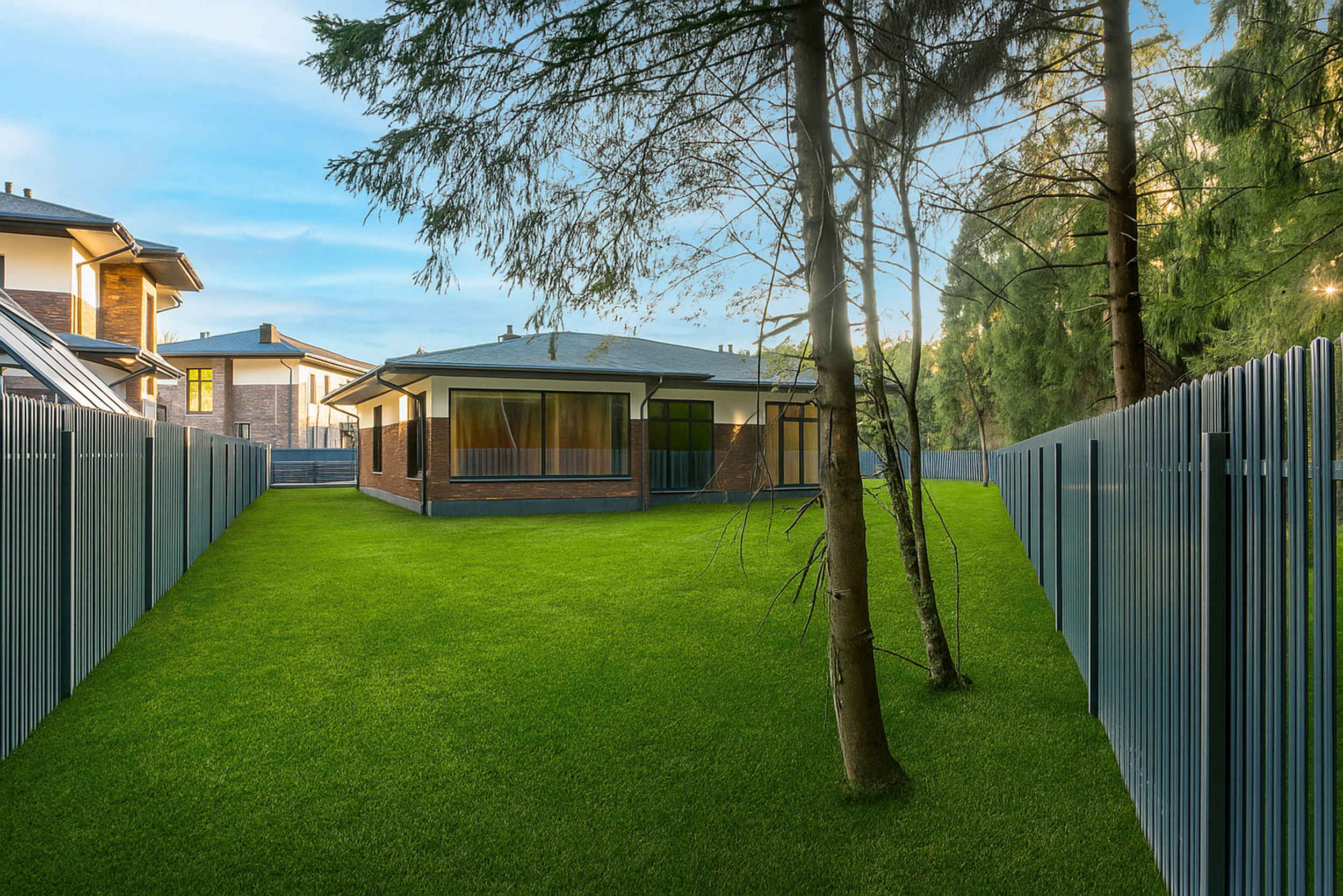 - Благоустроенный участок с газоном, брусчаткой и забором